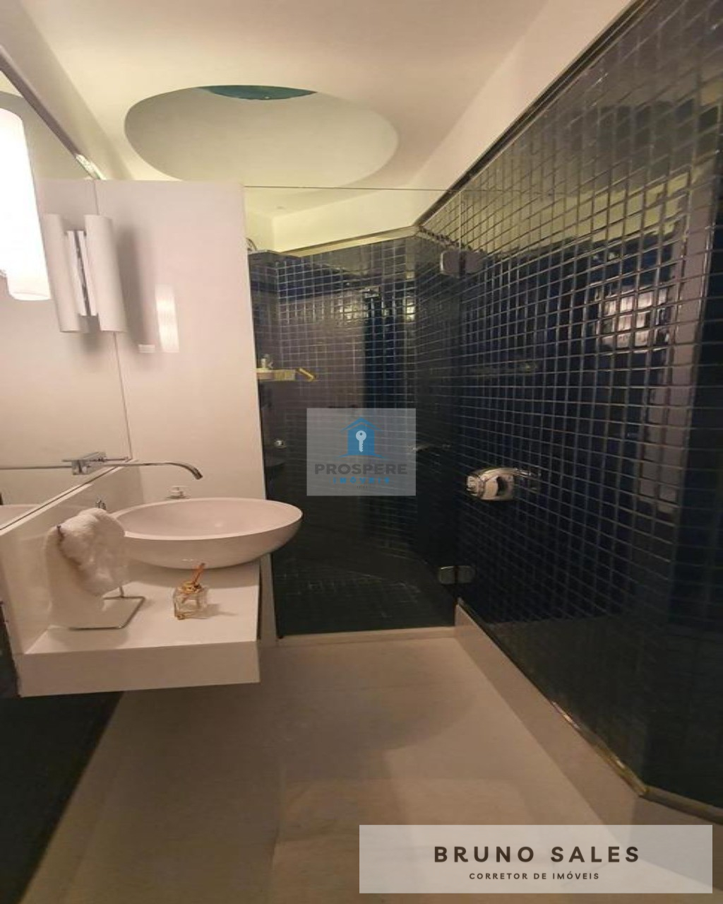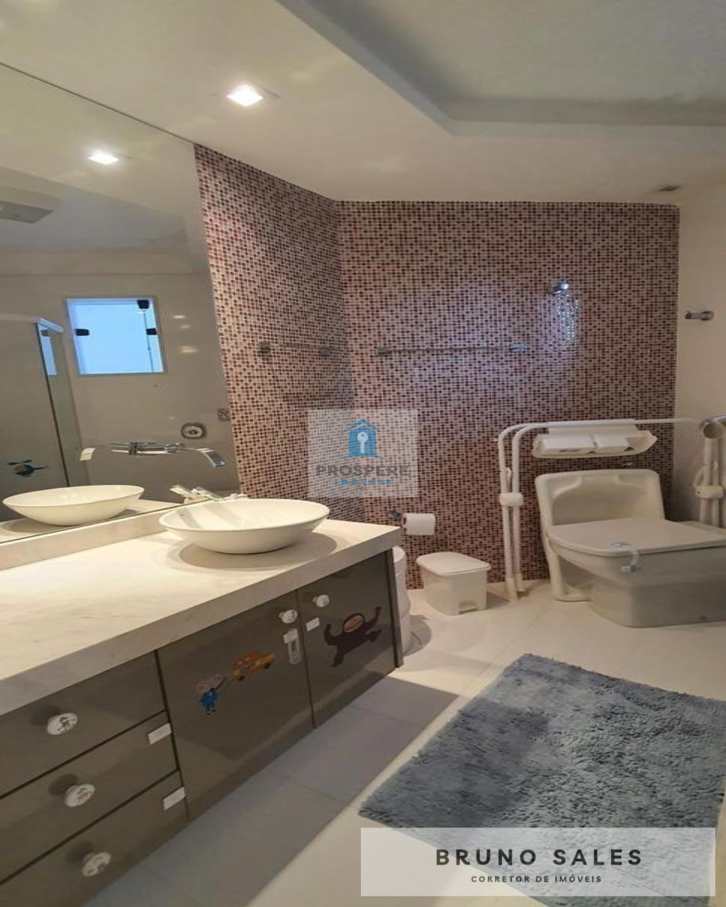 amplo banheiro com pia dupla suspensa, torneiras Hansgrohe,